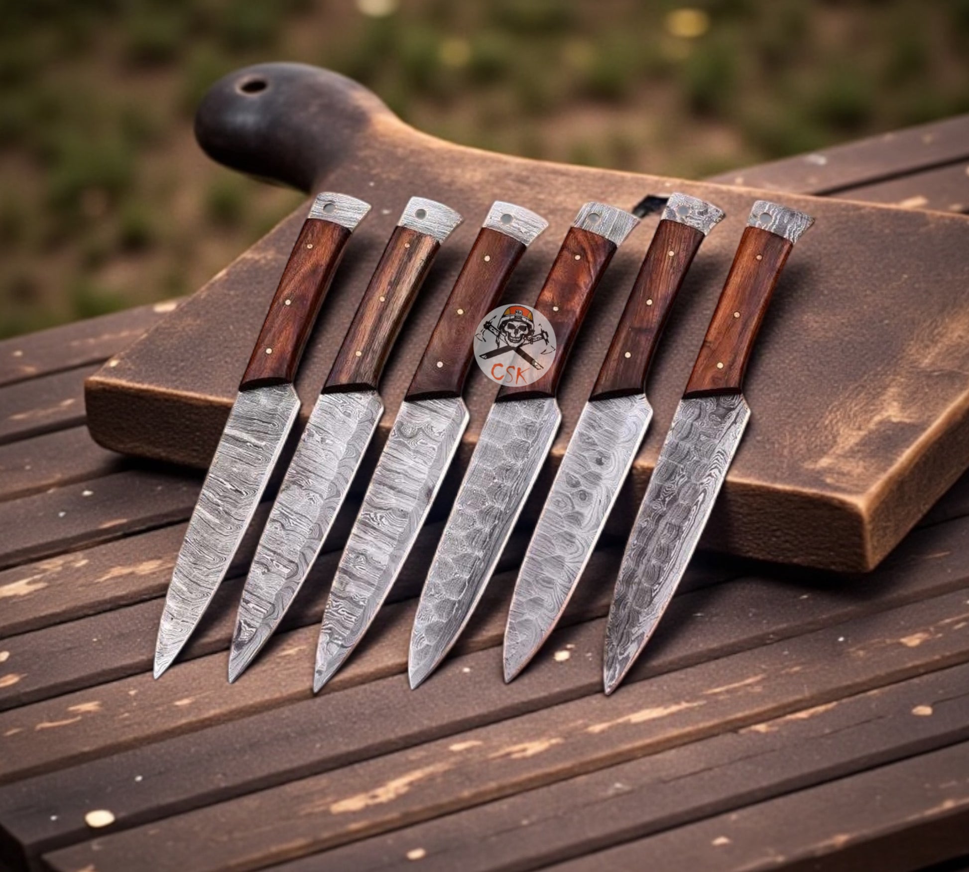 The perfect gift for the discerning home chef. This exclusive 6-piece Damascus steak knife set combines stunning handmade blades with a rugged leather travel roll. Ideal for weddings, Father's Day, or Christmas. Elevate any steak night or gourmet experience.