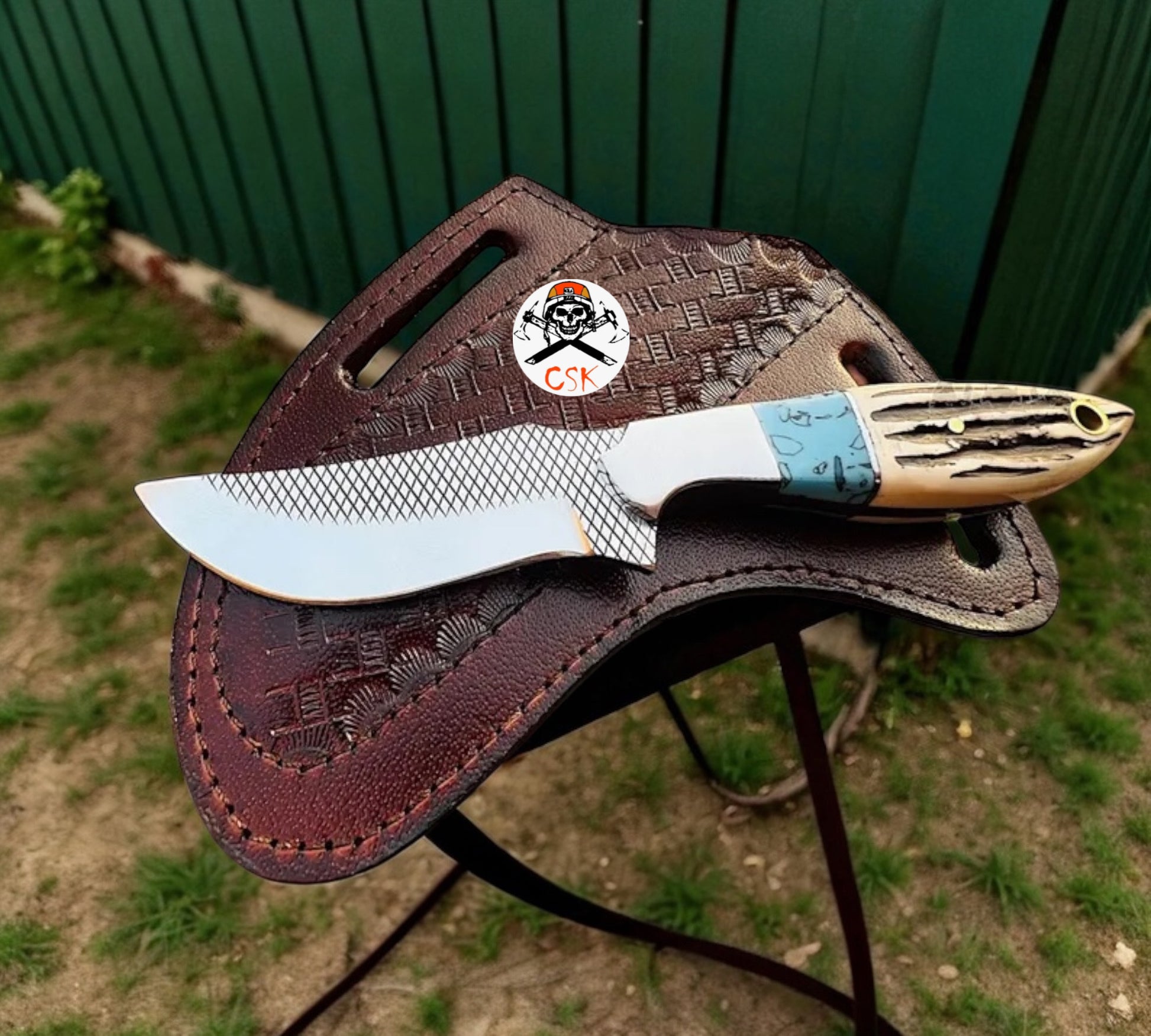 Cross Draw Sheath Hunting Knife With Rasp Steel & Antler Handle