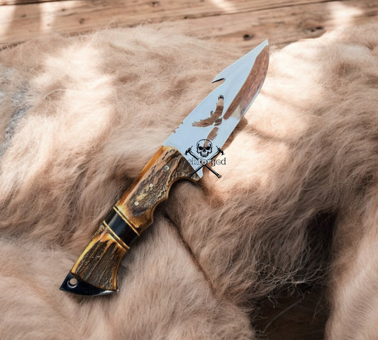 Hand-Forged Damascus Railroad Spike Knife – Antler Horn Handle