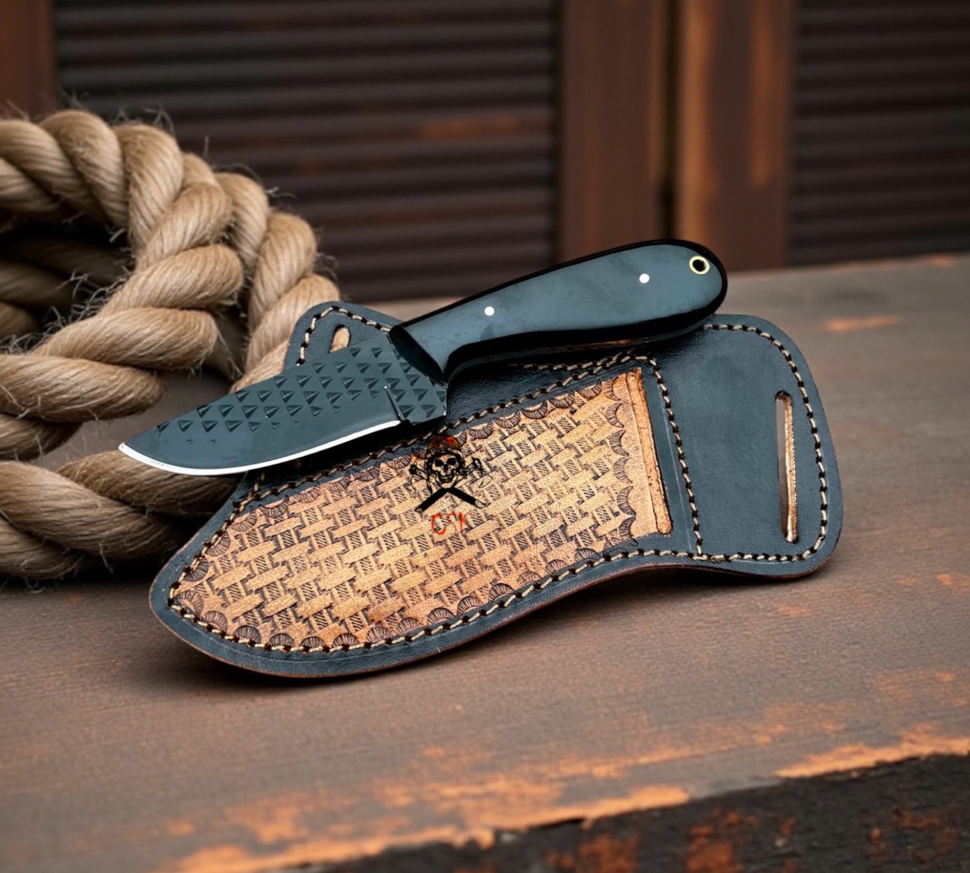 Elevate your everyday carry with this premium handmade Western cowboy belt knife, designed for authentic ranch life, hunting, and outdoor adventures. The blade measures a versatile 4 inches of high-carbon rasp tool steel (repurposed farrier file for superior toughness and edge retention), finished with a durable black powder coating that resists corrosion, reduces glare, and adds a sleek tactical look. The rasp-textured spine provides excellent thumb purchase for controlled cuts, making it ideal for skinning, slicing, or heavy ranch work.