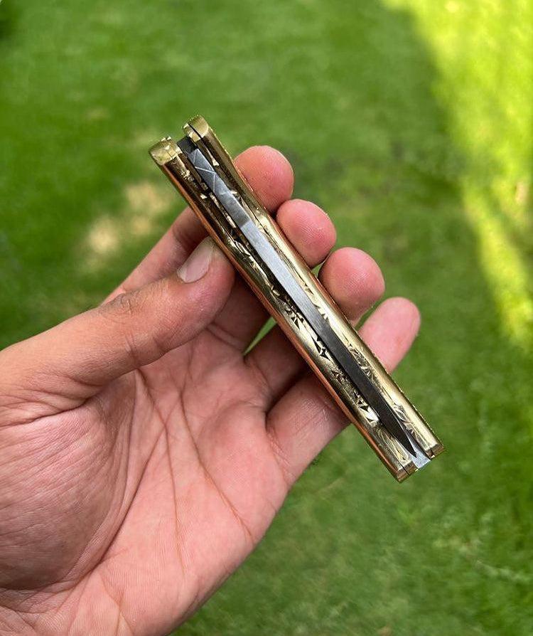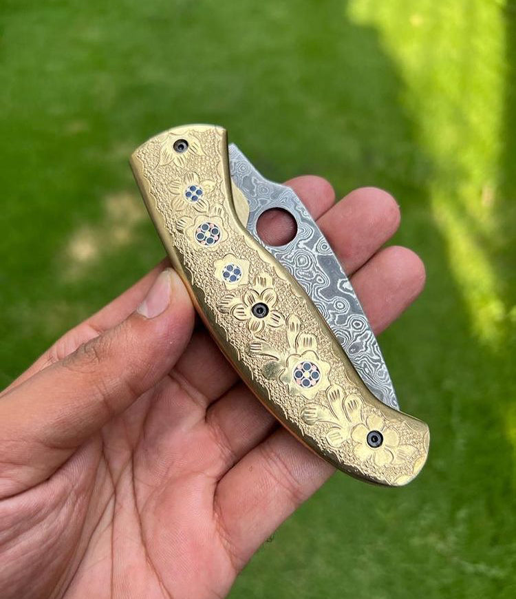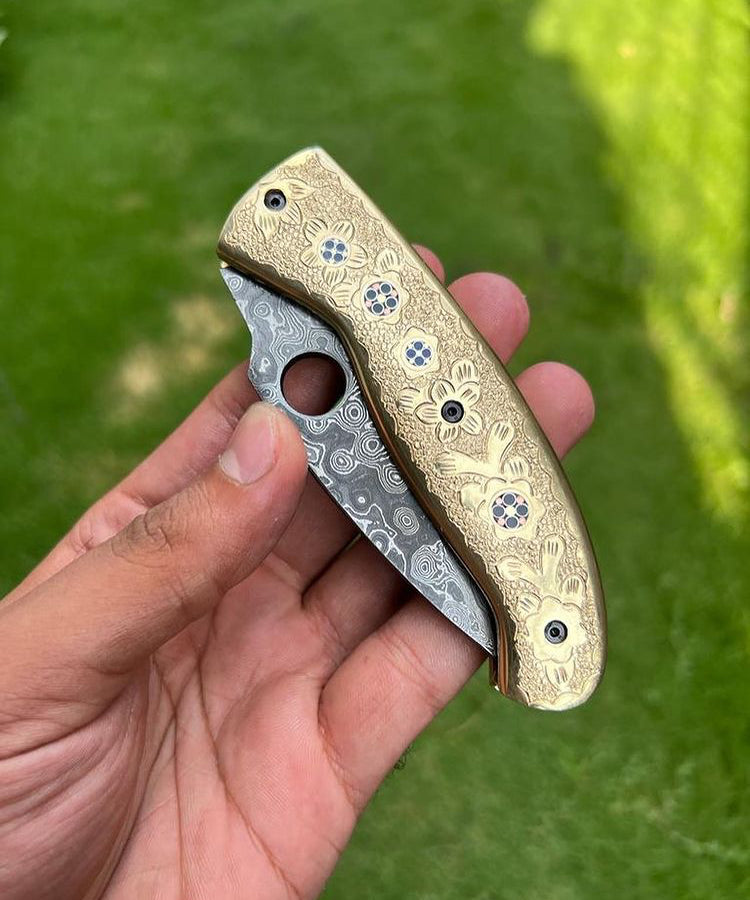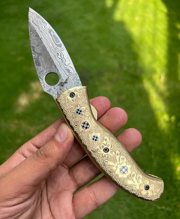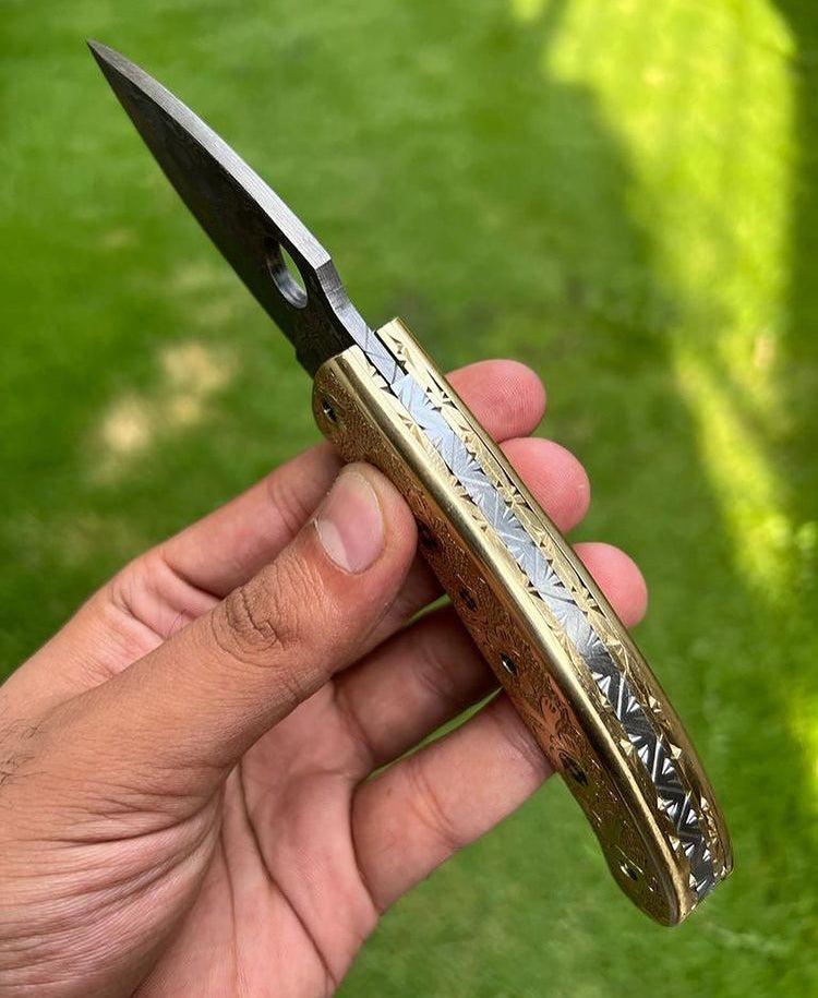 DAMASCUS STEEL FOLDING POCKET KNIFE WITH ENGRAVED BRASS HANDLE 8" CUSTOM KNIVES